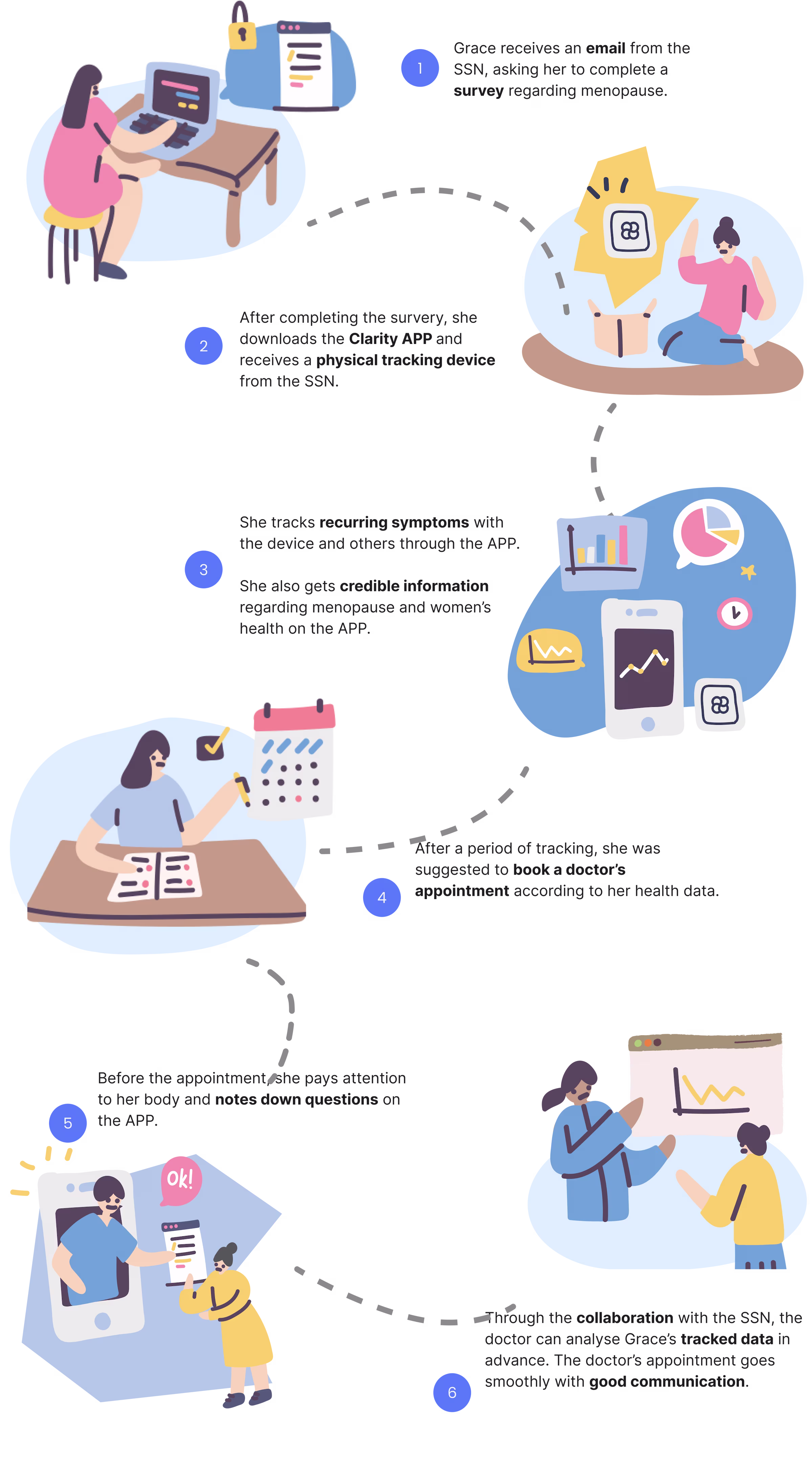 Clarity is a system designed to support women approaching or experiencing menopause. It combines a mobile app and a portable tracking device to help users monitor symptoms, track emotions, and gain insights for a healthier life. The system aims to improve communication with healthcare providers, empowering women to make informed decisions about their health and manage menopause more proactively.