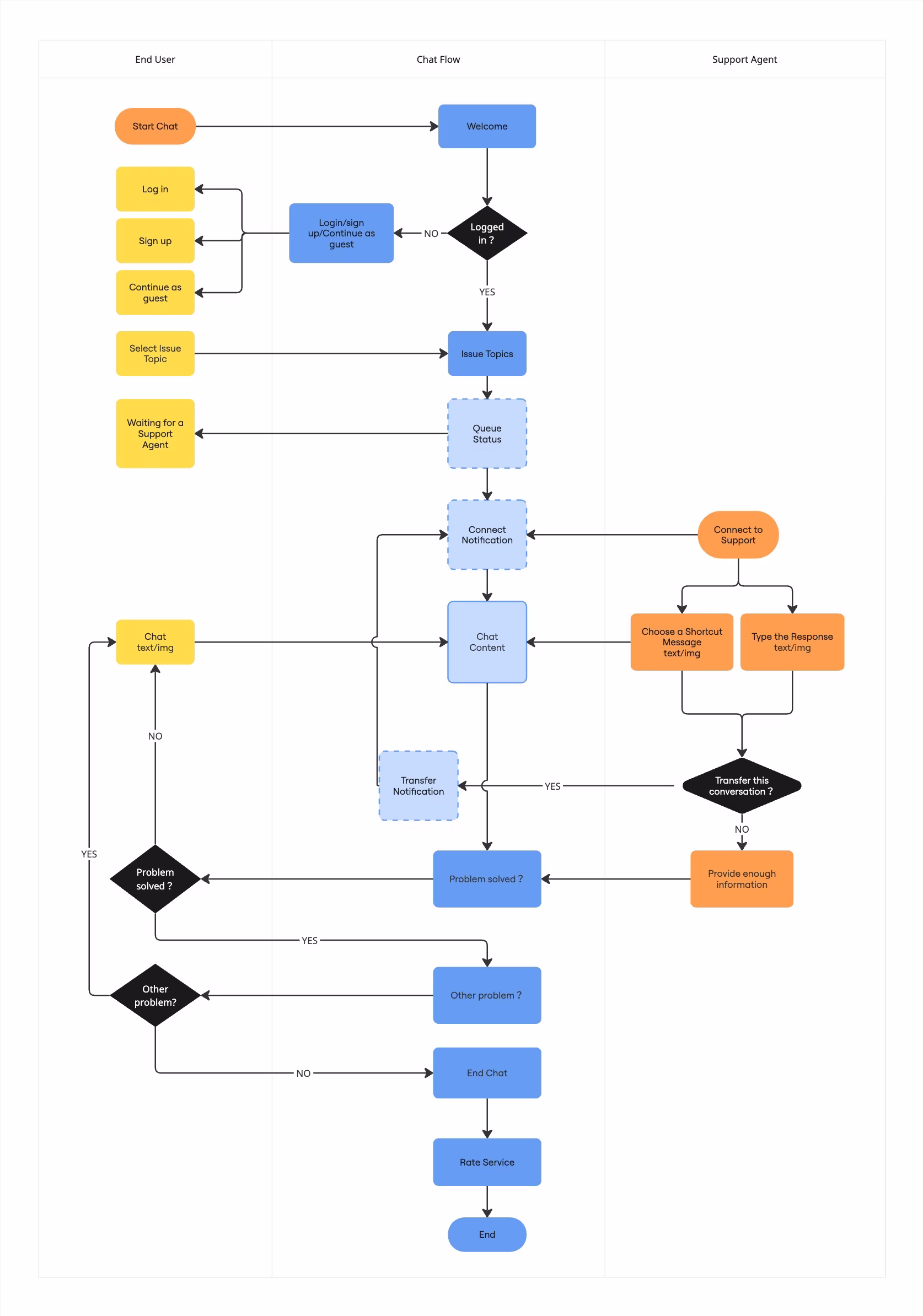 To design a chat system that supports both platform users and customer support agents, I mapped out two parallel user journeys. This helped identify emotional pain points, system limitations, and key optimization opportunities across roles.